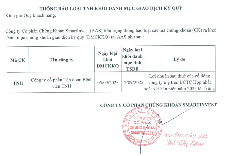 THÔNG BÁO LOẠI TNH KHỎI DANH MỤC GIAO DỊCH KÝ QUỸ